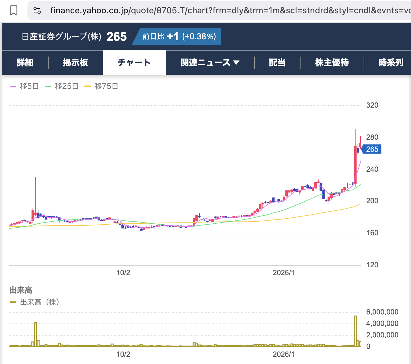 📈 8705日産証券の日足チャート。170円→290円の全貌